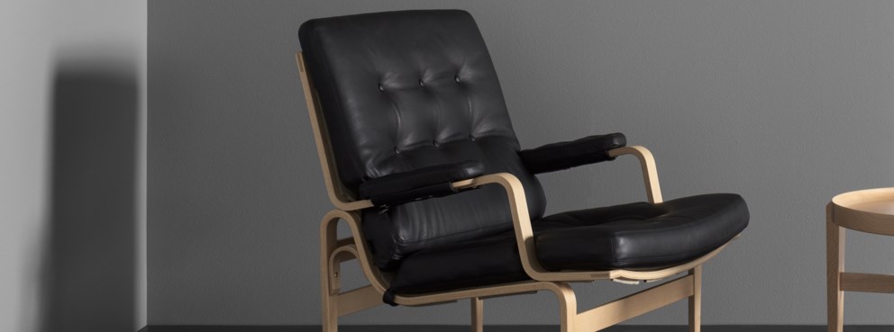 Klassisk lænestol designet af Bruno Mathsson. Ingrid er søster til Karin, men i formpresset bøgetræ. Ingrid har knapper på både sæde- og ryghynde.