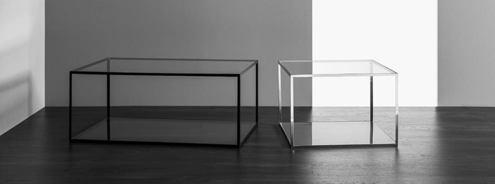 Et klassisk bord med firkantet form i krom eller sort metal med bordplade og bund i glas.
