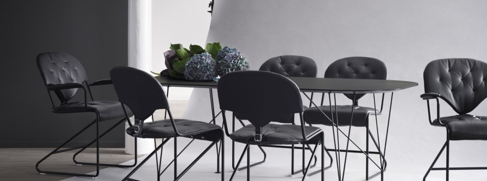 Ovalt spisebord, der opfordrer til samtale og øjenkontakt med alle gæster. Fås også i to andre versioner: et spisebord med to udtrækkelige bordplader og et mindre cafébord.