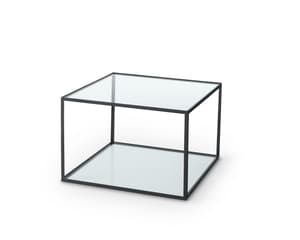 Et klassisk bord med firkantet form i krom eller sort metal med bordplade og bund i glas.