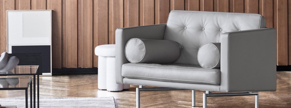 Ikonisk lænestol designet af Bruno Mathsson. Jetson-stolen afspejler både hans besættelse af komfort og en klassisk svensk tilgang til moderne design. Den har et skålformet sæde, en ergonomisk designet høj ryg med nakkestøtte. Drejefod i krom med en unik selvreturnerende mekanisme.