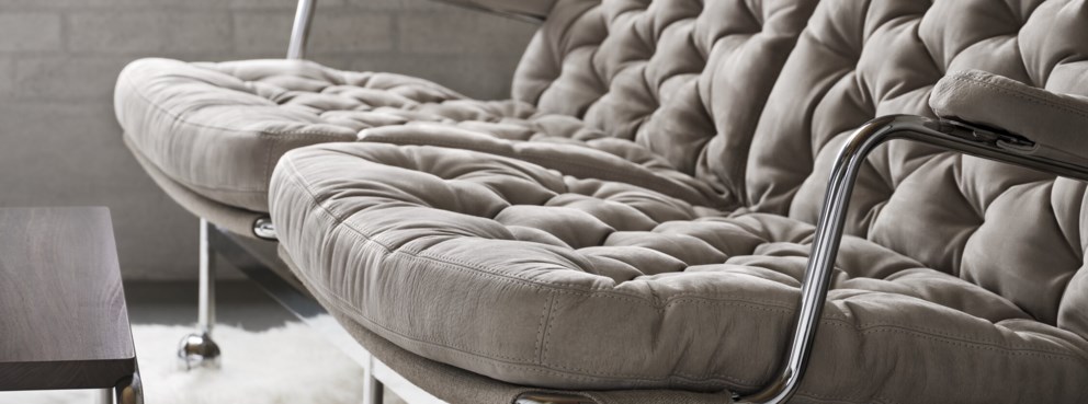 Karin 73 er en elegant 2-personers sofa baseret på et klassisk design med et fint kromstel og hynder med dybe syninger.