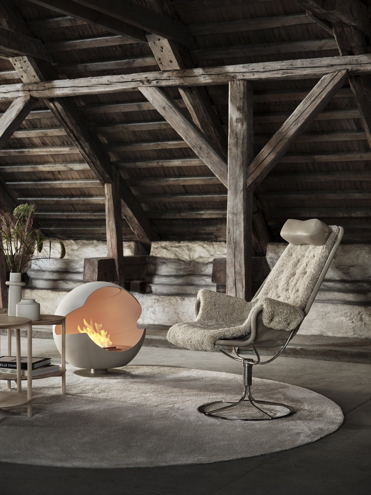 En ikonisk lænestol designet af Bruno Mathsson. Jetson-stolen afspejler både hans besættelse af komfort og en klassisk svensk tilgang til moderne design. Den har et skålformet sæde, en ergonomisk designet høj ryg med nakkestøtte. Drejefod i krom med en unik selvreturnerende mekanisme.
