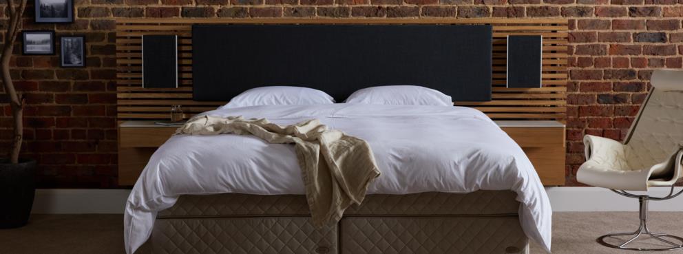 En omhyggeligt forarbejdet sengegavl i massivt træ, udstyret med innovativ Bang & Olufsen-teknologi. Designet og udviklet i et samarbejde mellem Bang & Olufsen og DUX.
