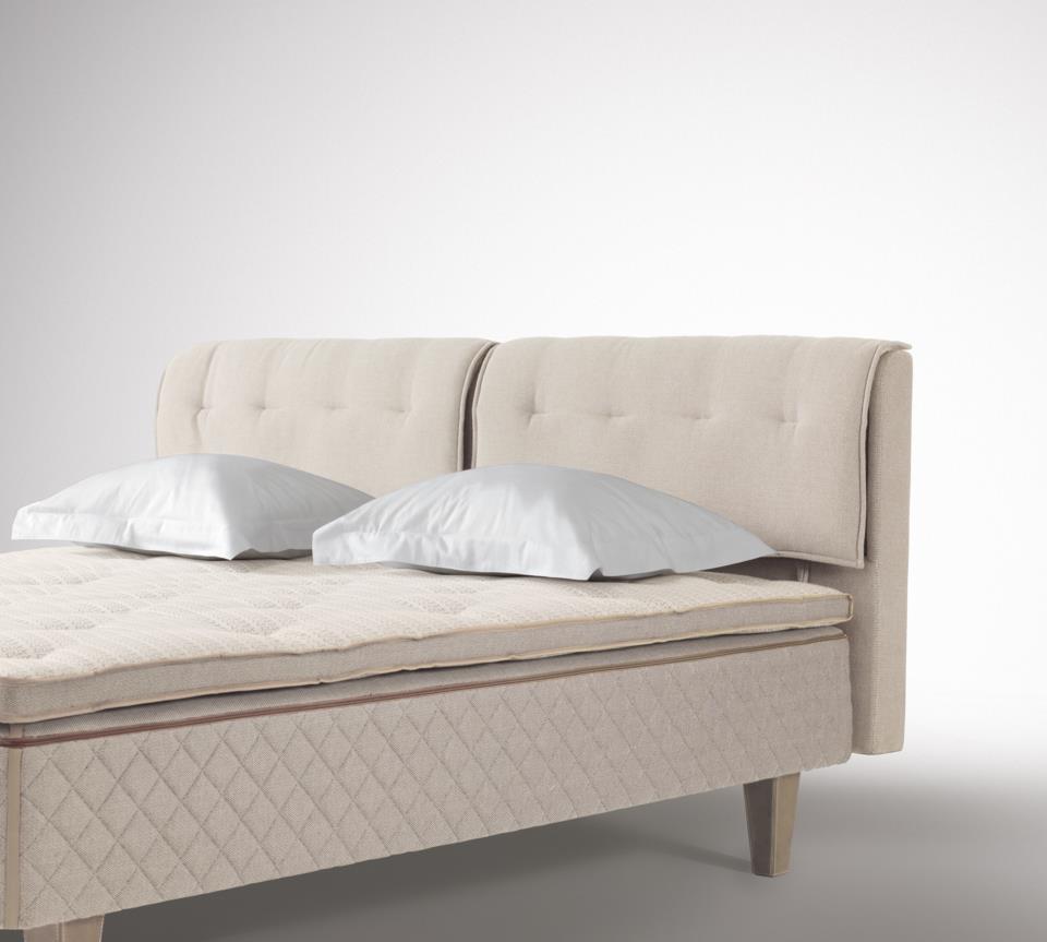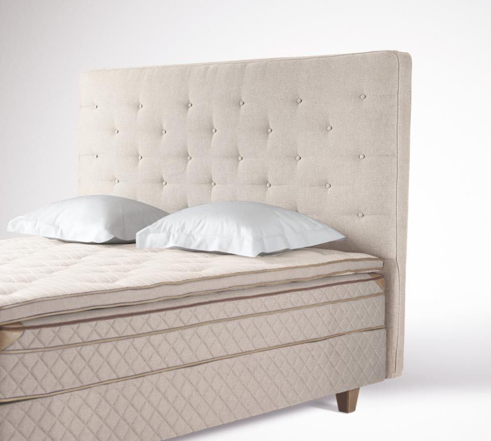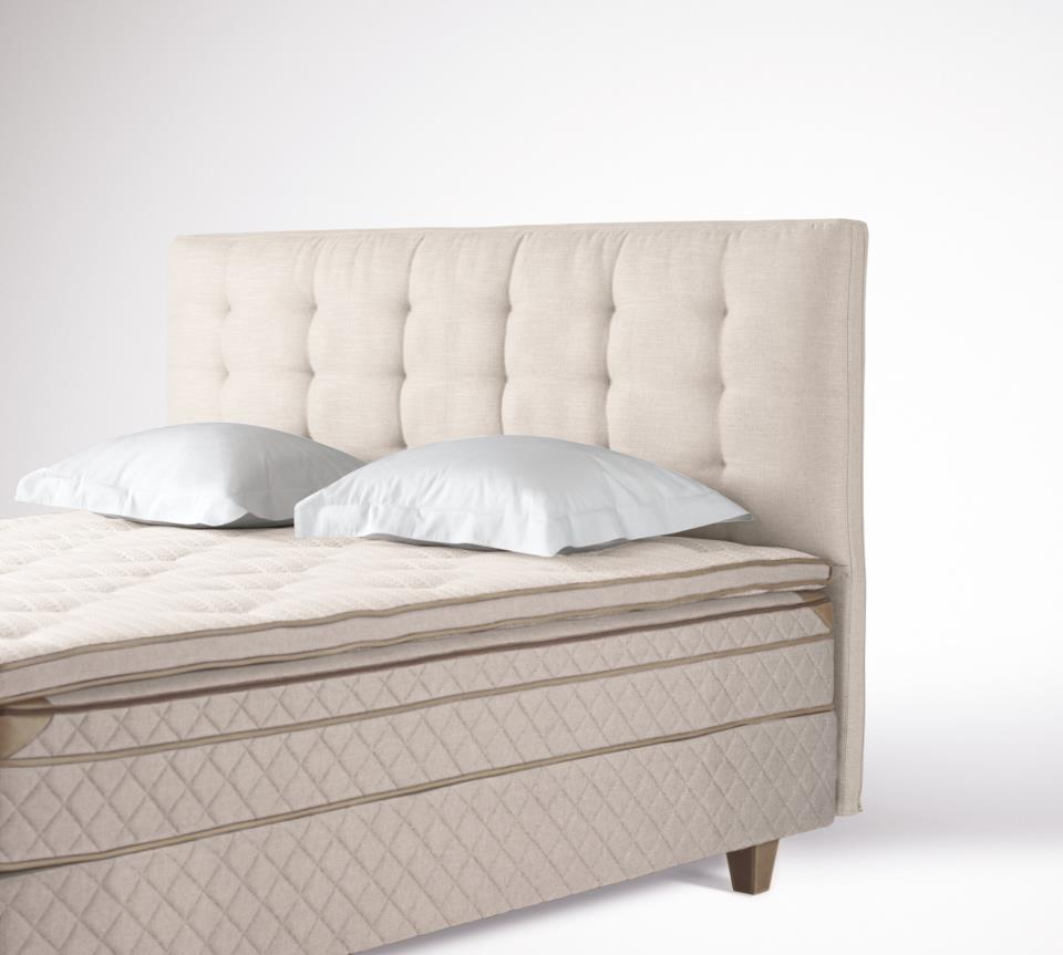 En sengegavl med blødere polstring, syet eller med knapper.